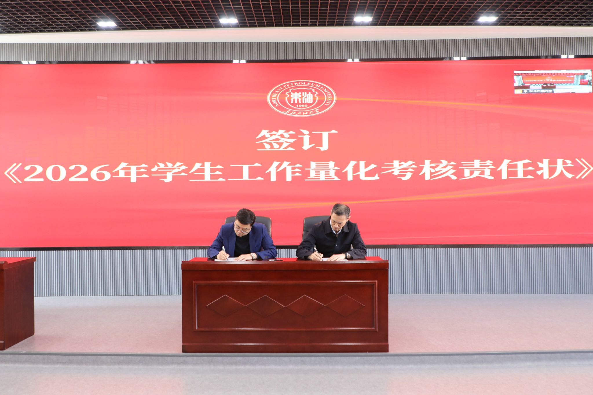 于长青代表学校党委与各学院签订《2026年学生工作量化考核责任状》。