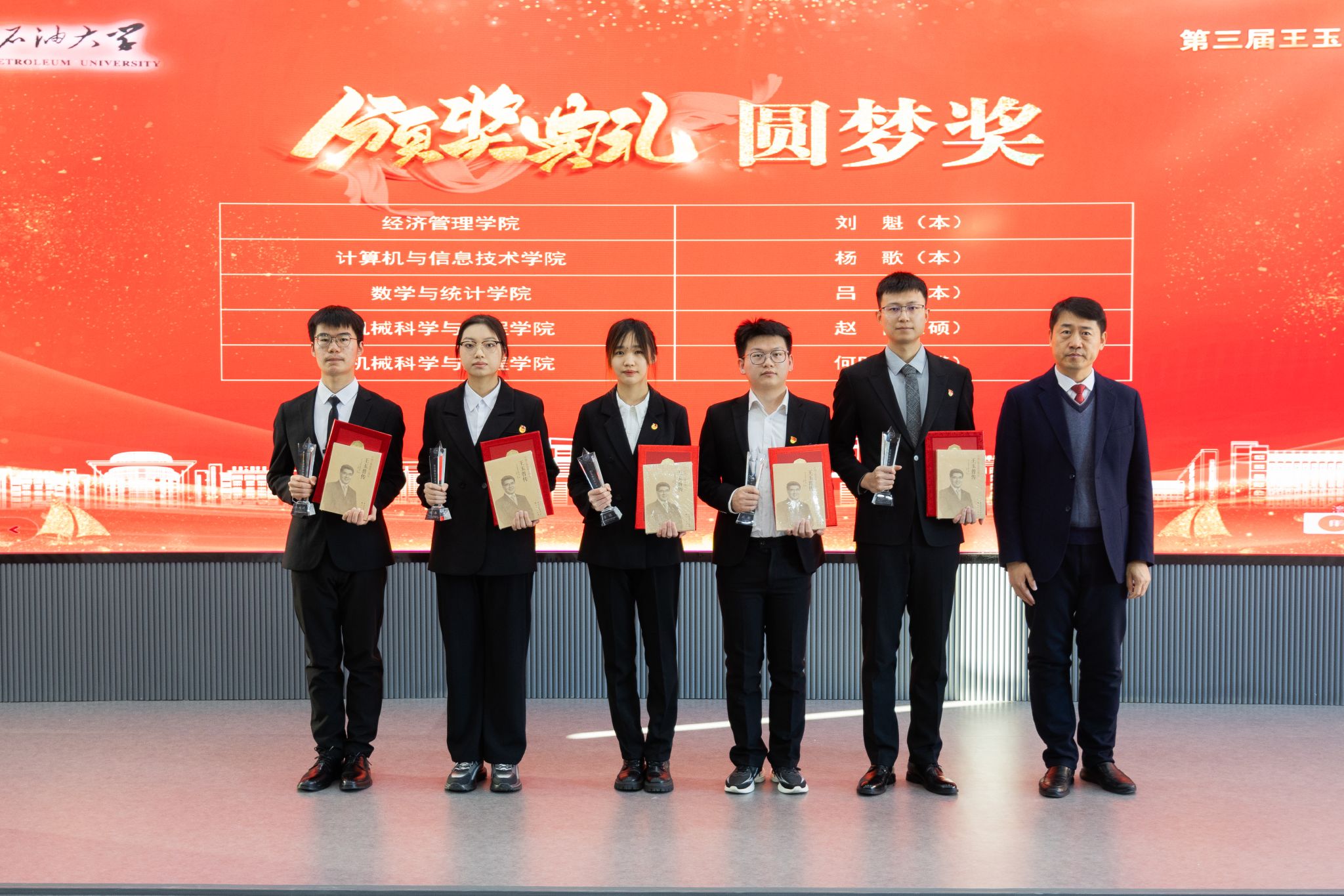 (通讯员 逄博 记者 胡玉喆 摄影 关正昊)12月5日,我校在1H211隆重举行第一届王玉普杰出青年教师奖、第三届王玉普励学奖学金颁奖典礼暨院士报告会。我校杰出校友、中国工程院院士刘合,华油惠博普集团终身名誉董事长黄松,校党委书记付晓飞,校长董宏丽,校党委副书记高洪峰,副校长杨二龙、王志磊、康守强,校党委常委、组织部部长张智勇,相关职能部门及院部负责人,获奖师生及师生代表齐聚一堂,共同缅怀王玉普院士崇高风范,见证荣誉时刻,共话使命担当。高洪峰主持。