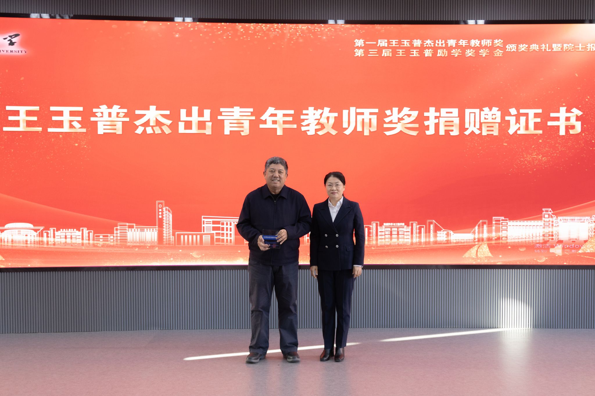 康守强宣读第一届王玉普杰出青年教师奖表彰决定。刘合为获奖教师王宁颁奖并赠书《王玉普传》。