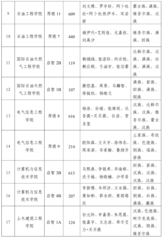 为深入推进民族团结进步教育,构建各民族学生互嵌式生活社区,学校学生工作部、“东油同心•石榴红”民族团结进步教育辅导员工作室组织开展了第一、二批“石榴籽小屋”申报创建工作。经宿舍自愿申报、学院初审、学校复审及实地考察,现确定两批共45个宿舍为东北石油大学“石榴籽小屋”,现将具体名单公示如下: