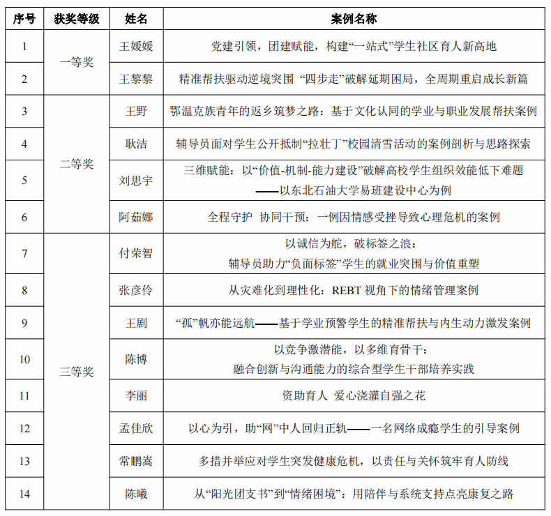 为进一步加强我校学生工作队伍建设,提升学生工作专业化水平,总结推广学生工作先进经验,学生工作部组织开展了优秀学生工作案例评选活动。经过专家评审,共评选出一等奖2名、二等奖4名、三等奖8名。现将获奖名单公示如下: