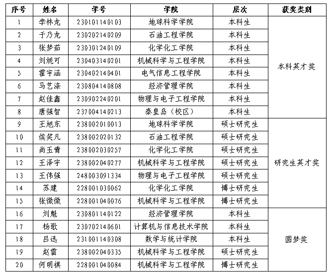 依据“王玉普励学奖学金”评选要求,经基层单位推荐,学生工作部审核,学校联评,以下20名同学获得东北石油大学第三届王玉普励学奖学金,现公示如下: